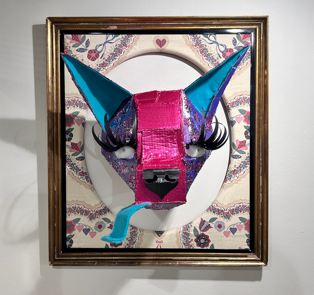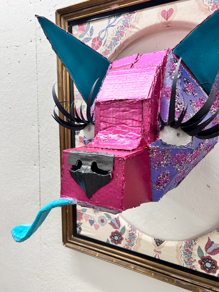 Found frame and fabric, cardboard, hot glue, acrylic paint, glitter, construction paper and felt