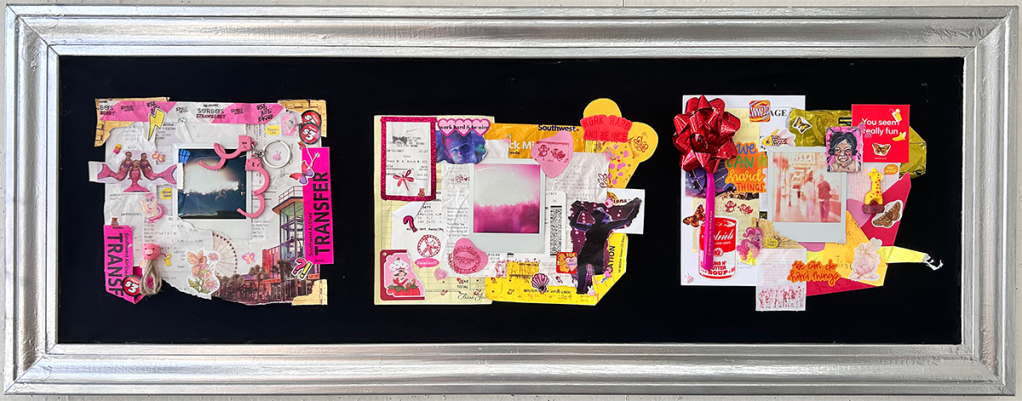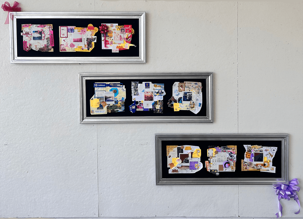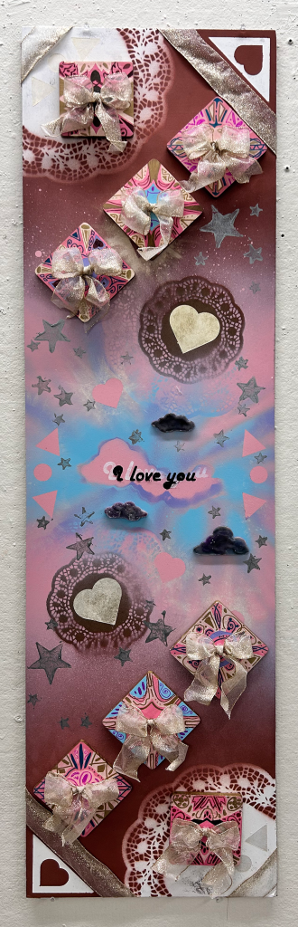 Masonite, spray paint, wood wax, puffy paint, acrylic paint, alcohol markers, ribbon and alcohol ink