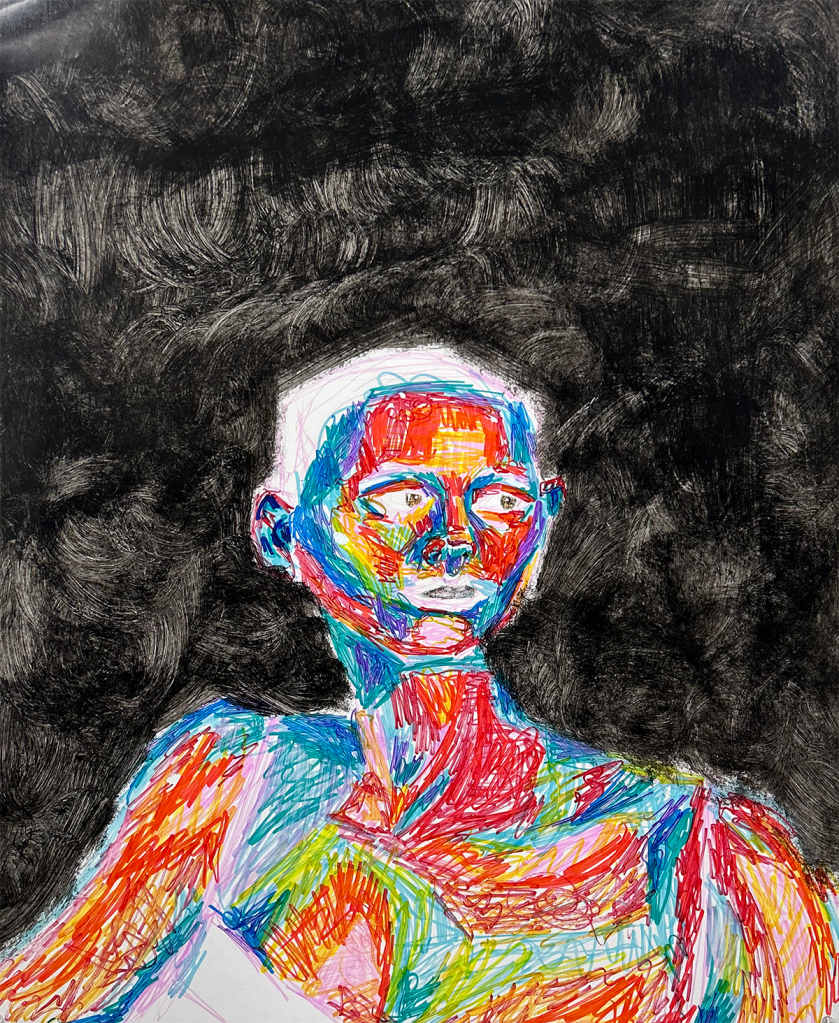 Acrylic paint, colored pencil, and alcohol markers
