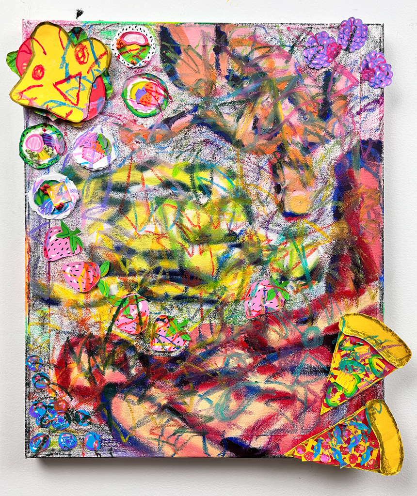Crayon, oil pastel, oil paint, construction paper, and alcohol markers